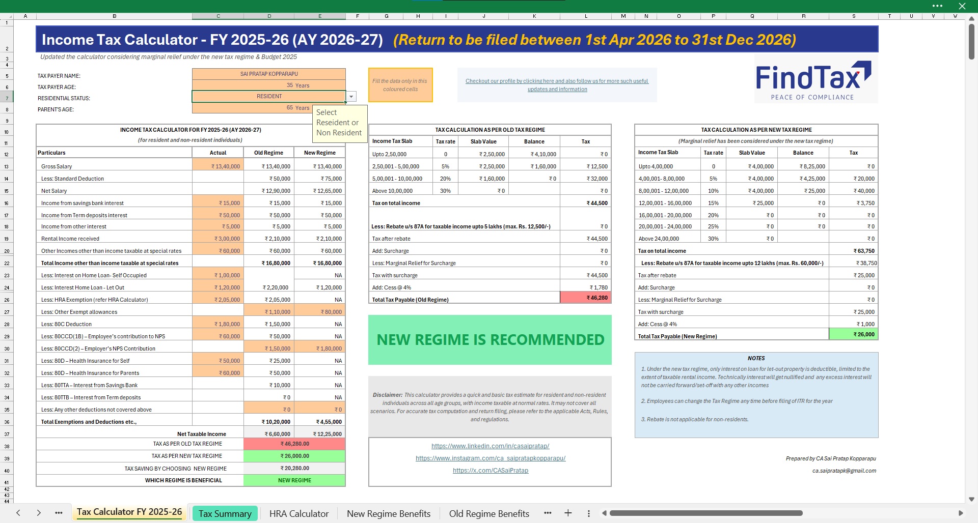 📥 Download the Tax Calculator Excel File here: 👉 Click here to download the Excel Tax Calculator FY 2025-26 (AY 2026-27)